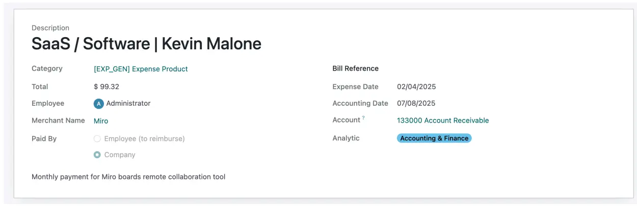 Purchases made with Ramp cards are automatically imported into Odoo as expenses. Each transaction generates a corresponding expense report and journal entry, keeping the general ledger up to date.