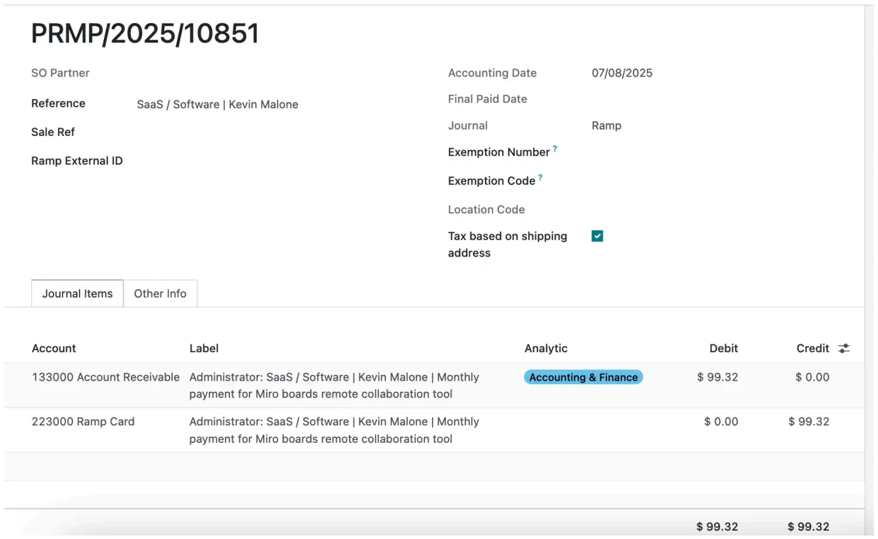 - Accounting Tags: Ramp's accounting fields are mapped to Analytic Distribution