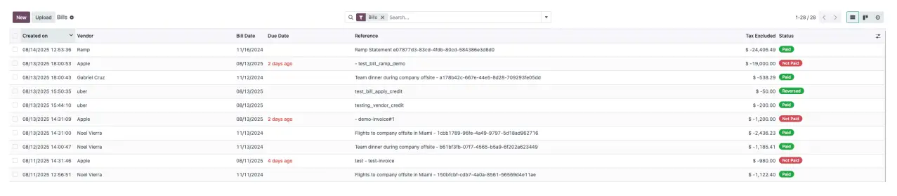 Bills created in Ramp are automatically synced into Odoo as Vendor Bills. The integration handles both the initial bill creation and subsequent payment processing, ensuring complete financial tracking from bill receipt to payment settlement.